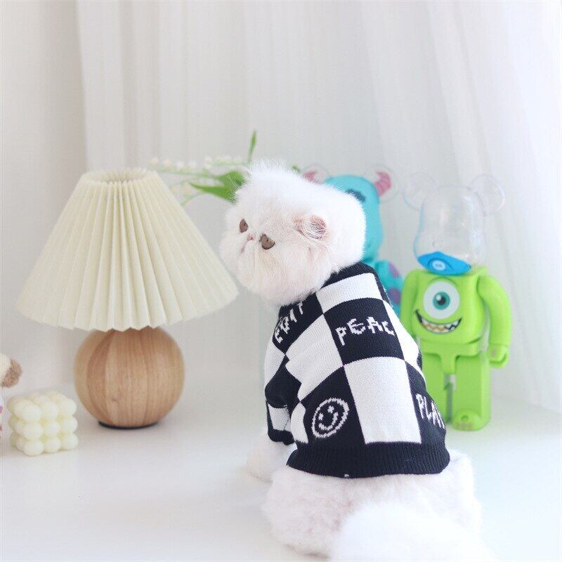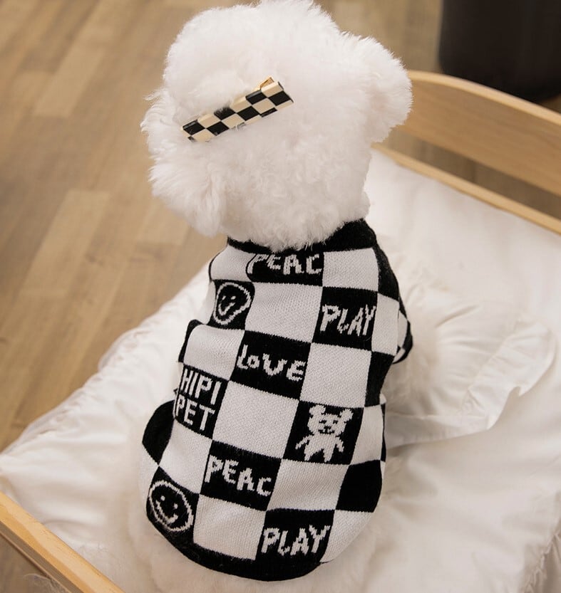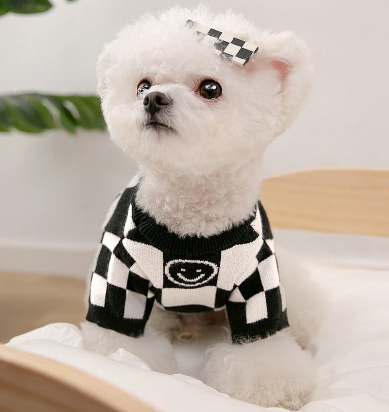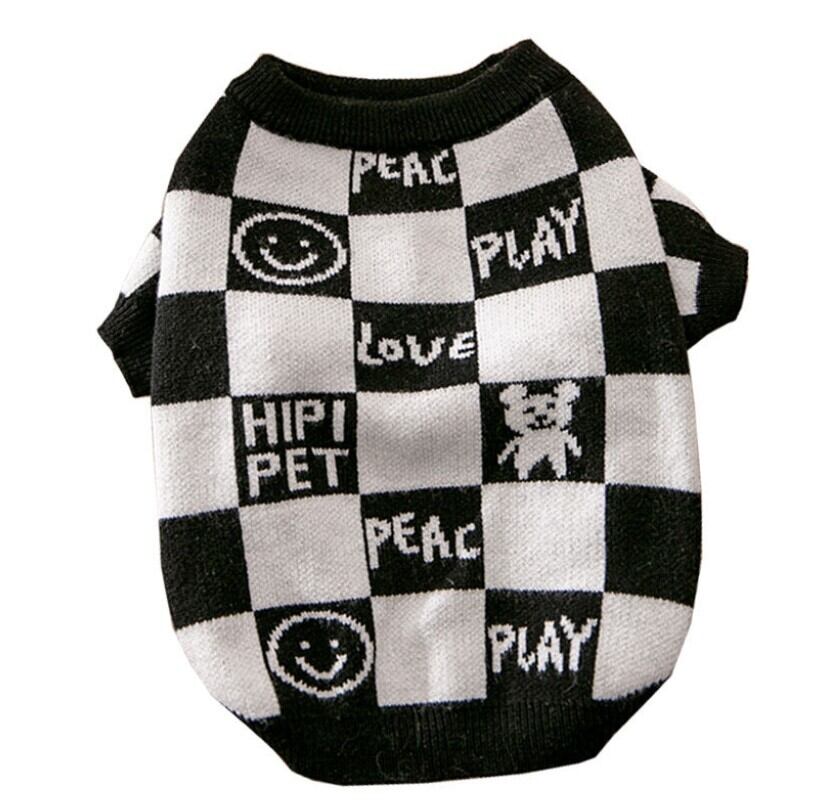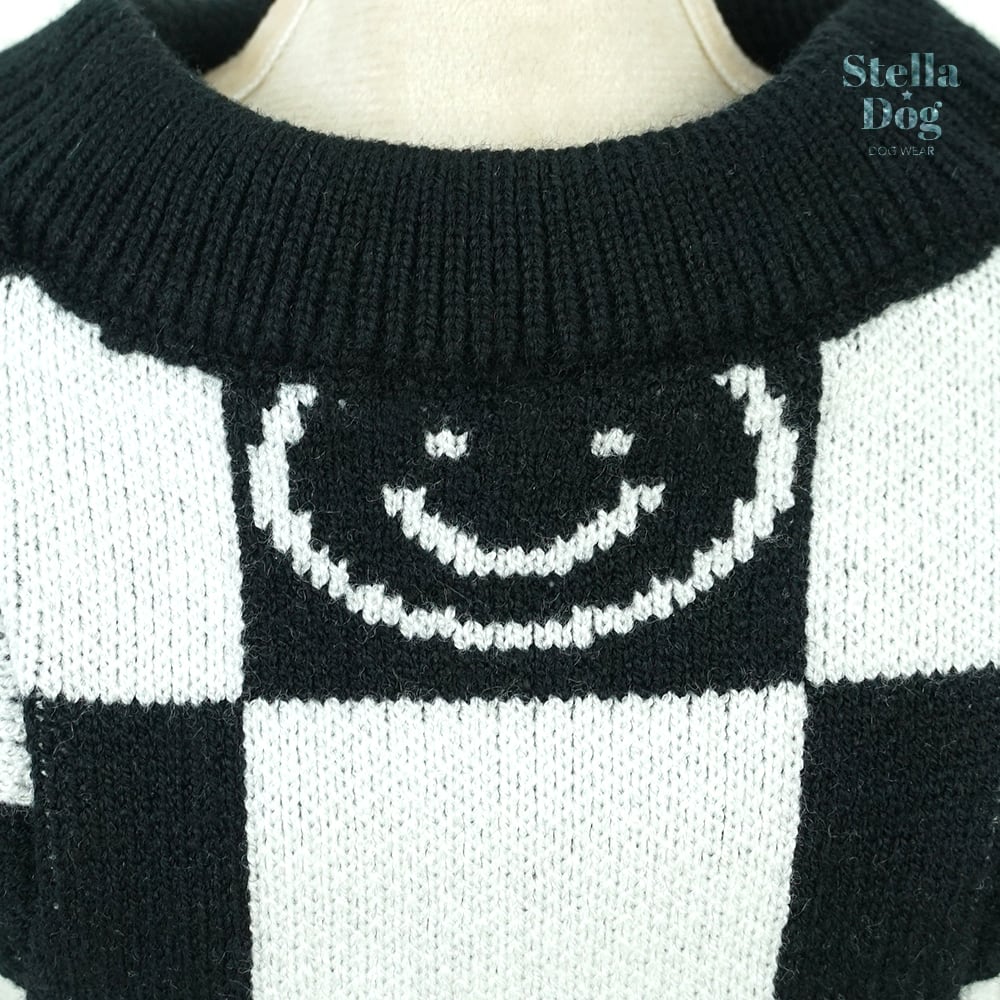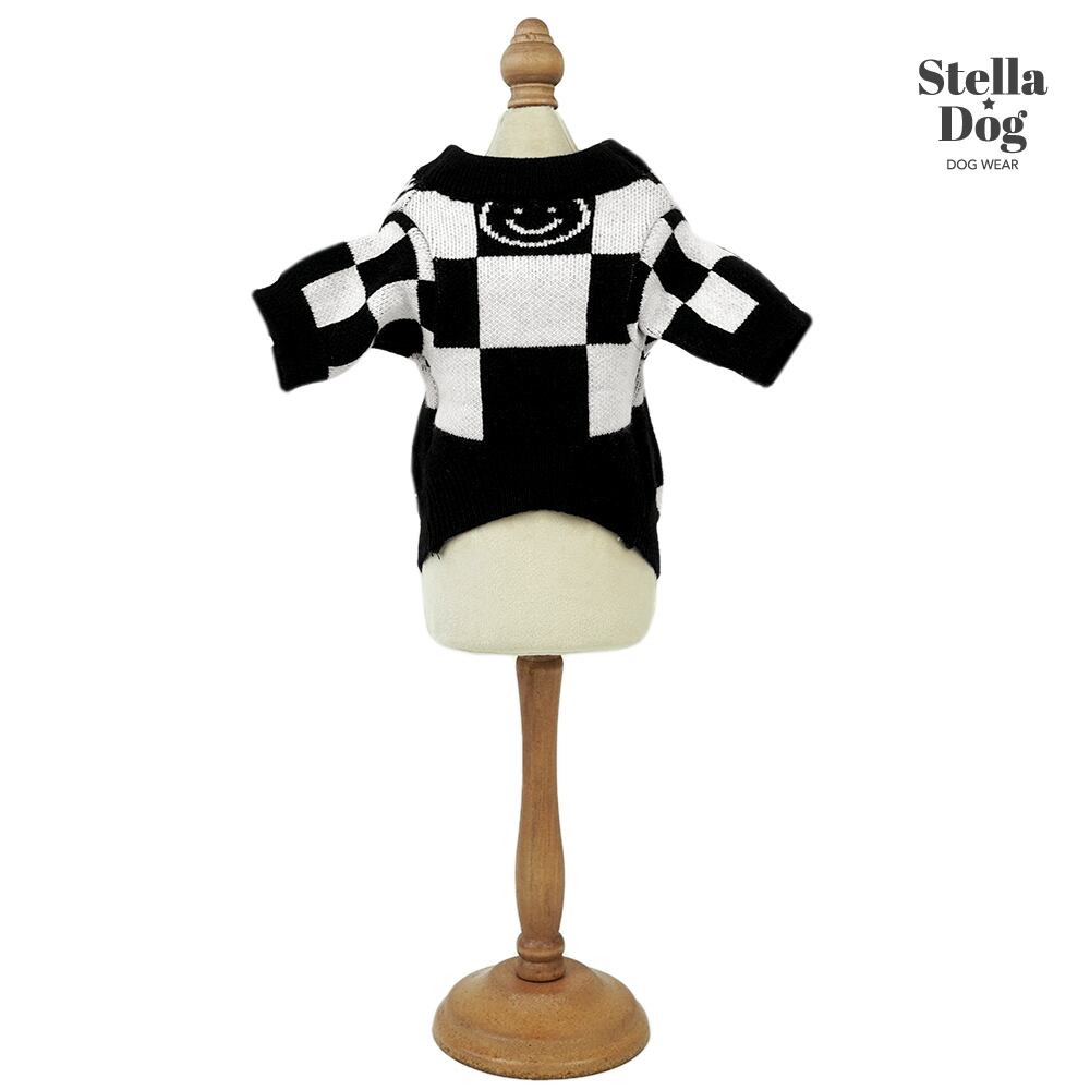 ★【閉店セール全品半額】ブロックチェック柄ニット セーター ニコちゃん 白黒 モノトーン 犬服 ドッグウェア 秋冬